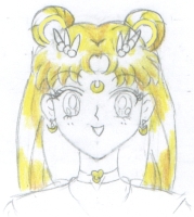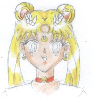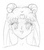Step 9. Final details, her eyelashes, Sakura opened her mouth slightly, and added more hairlines. This is a completed picture of Usagi. If you like, you can ink it like this and leave it that way. If you want to make her into Sailor Moon, you can look at the next step and add in the earrings, choker, collar, hair decorations on her buns and bangs, and the crescent moon. (It's just a circle that doesn't close at the top with a smaller circle inside toward the top.) |