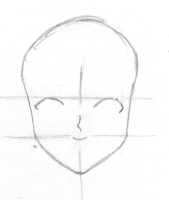 Step 1. To start out, draw the basic head shape. This might take a few tries but don't give up! Everyone has a different style and you'll develop your own the more you draw. The shape is a wide v that bends inward a little at the cheeks and up to the temples before it bulges out a little and curves around the skull. Draw in your guidelines, one across the cheeks, and another at the temple (should be the middle of the face). The center line down the middle splits it in half. |