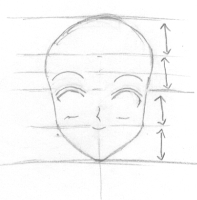Step 3. Shown here are the four even sectors: each section marked by the double arrows is approximately the same height. Add the eyebrows halfway between the top of the eyes and the hairline (the highest line, just added here.) Also, add a line that runs with the top eye line but just above it, that is the eyelid. The bottom line of the eye is even with the point in the nose. |