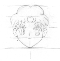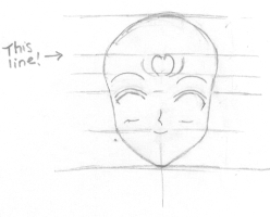 Step 2. Next, use the bottom guideline to add the mouth in. The top of the eyes touch the top guideline at the highest part of the curve and notice how they curve in a little at the outer ends. The nose is a little above the mouth, remember to make it that lower pointed shape like the characters in Sailor Moon have. |