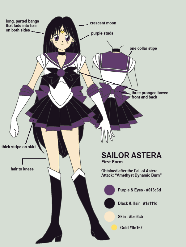 There are a lot of images of Sailor Astera in the galleries here on SailorAstera.com and I deeply appreciates ever single fanart that I receive. However, one breif look through the gallery and it's clear that not all of the Astera Art images depict Sailor Astera in her actual, correct design. In fact, my OWN Astera Art page has older images that are quite inaccurate themselves! ^_^In order to avoid confusion for artists and fans, I have created this page which features the more accurate references. Please feel free to use this page as a reference when creating fanart that features Sailor Astera!