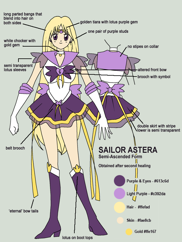 Sailor Astera has a few additional forms that I do not have totally accurate references for yet. These forms are: Myu Sailor Astera, Dark Princess Astera, Sailor Radium Amethyst (AU animamate form), Healed Princess Astera, Past Princess Astera, and a civilian form.Return | Next