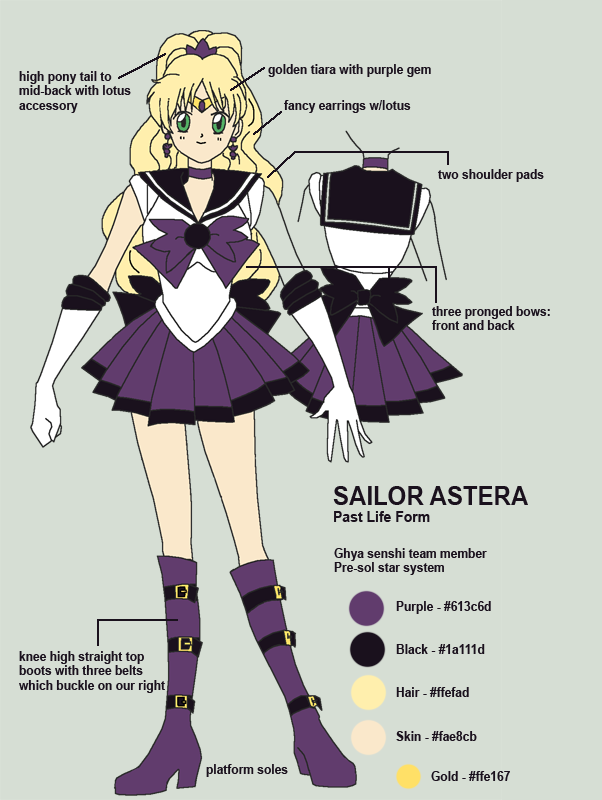 Sailor Astera later discovers that her planet is left over from an ancient solar system. In her past life, she had a slightly different outfit when she was a member of the Ghya Senshi.