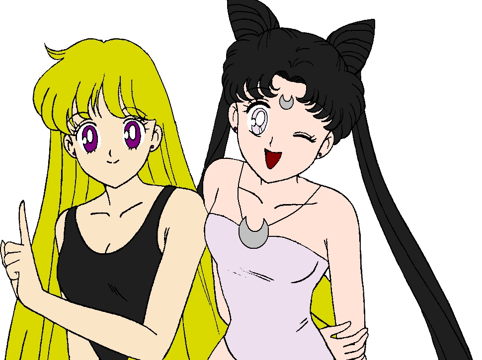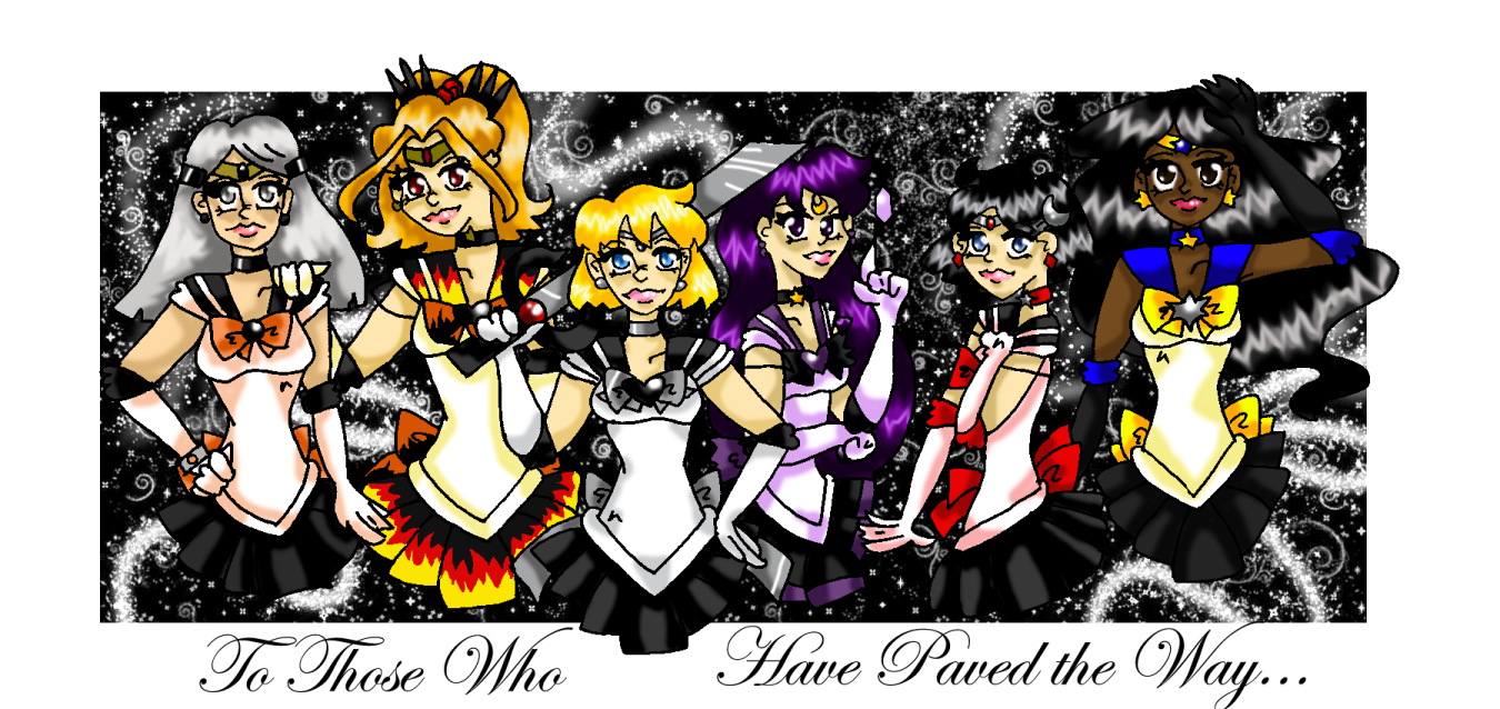 Caleigh created these images featuring Sailor Astera. The first is a combined version of Astera's dark and light forms. The left side says "dangerous," the right says "benevolence," and the center is "destiny." Fabulous huh? The second image is a collection of otaku senshi from the 'old school.' These are some of the characters that started almost a decade ago! Wow, we are getting old. :3 To see more of Caleigh's awesome artwork, check out her DeviantArt page.