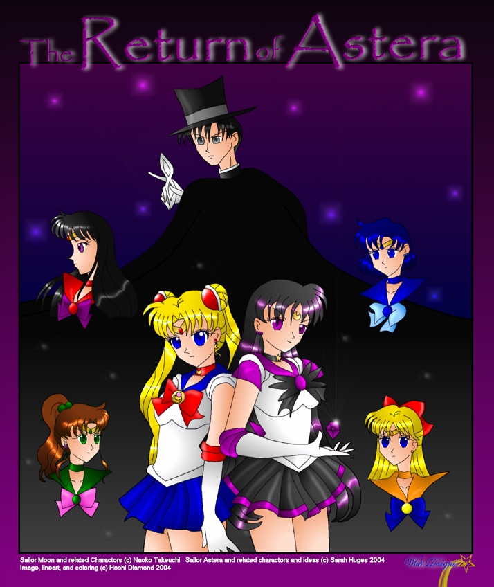 Hoshi is really amazing at these types of edits. Check out her page Dreams of Otaku Senshi The first image is Sailor Astera ready to kick some serious butt! Thanks so much for this wicked cool image! The second is a healed Astera giving you the eye. *wink* Next is a hand drawn image of Astera in mid transformation, followed by a mean looking Astera using one of her attacks! Then a sad image of Astera suffering from a terrible attack, and after that, an icy stare from the Senshi of Revenge!