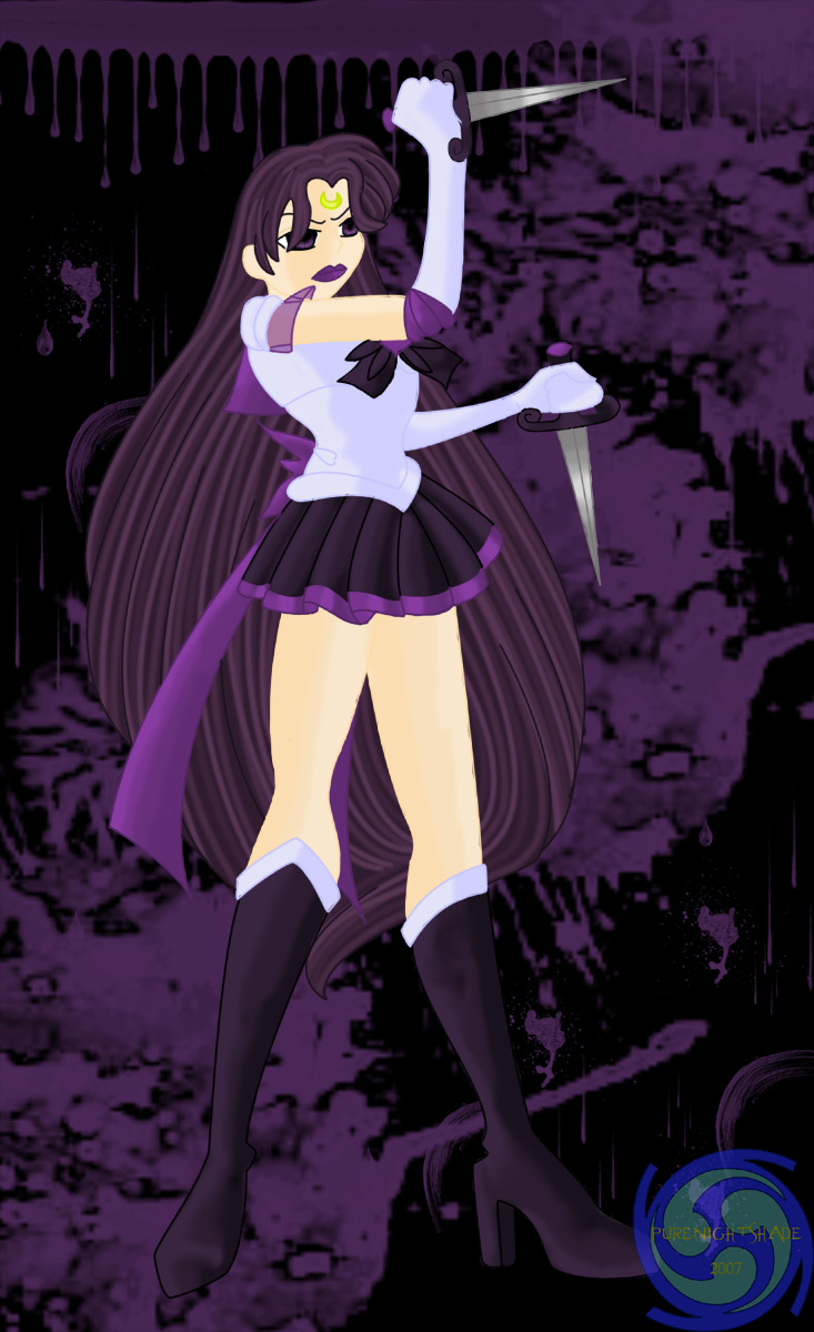 Purenightshade made this great group image which includes Sailor Astera. Other otaku senshi in this image are Sailorpegasus (owned by Aya-sh), Sailor Taurus (owned by Sailor Taurus), SuperSailordraco (by Purenightshade), Sailor Heaven (owned by Meshia), Sailor Charon (owned by McMuu) & Super Sailor Caloris (owned by Himeno). The next image is a hand drawn requested CG of Astera including her daggers. Pure also drew her design of the daggers in a seperate image. The next image is a chibi picture of Sailor Astera and Sailor Obsidia because cute can be evil too. :3 She did a sketch of Astera Ascended for me, as well as a partial group portrait of Astera's past life's team. Check out her collective of sites at Keverynn.net and her DeviantART Gallery.