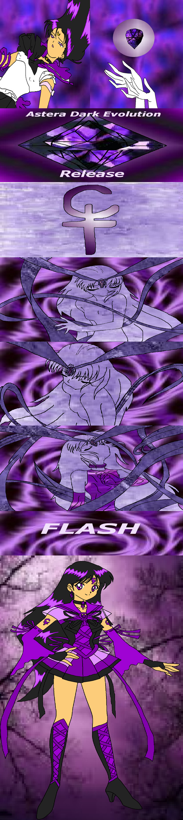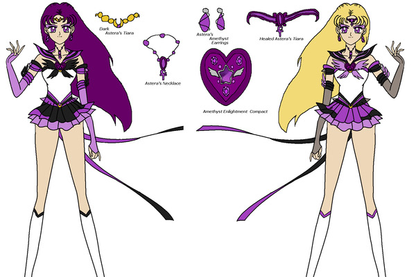 This lovely little fanart (which was also made into an award!) was given to me by a friend, WaterButterfly. I really love the pose! And the second image is also awesome; I love her hand drawn style! The next images are a duo of Astera's forms and a super awesome rendition of an Astera Princess dress (with wings!) Then we have Astera in civi form calling her henshin and turning into evil Astera! The last image is a new form of Sailor Astera that WaterButterflyA designed to be an AU form. I also think it's just wonderful! She's so creative with her outfit designs!